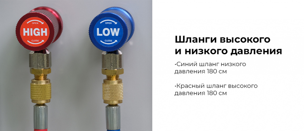 - Длина заправочных шлангов — 180 см, что обеспечивает удобство работы и доступ к труднодоступным точкам подключения.